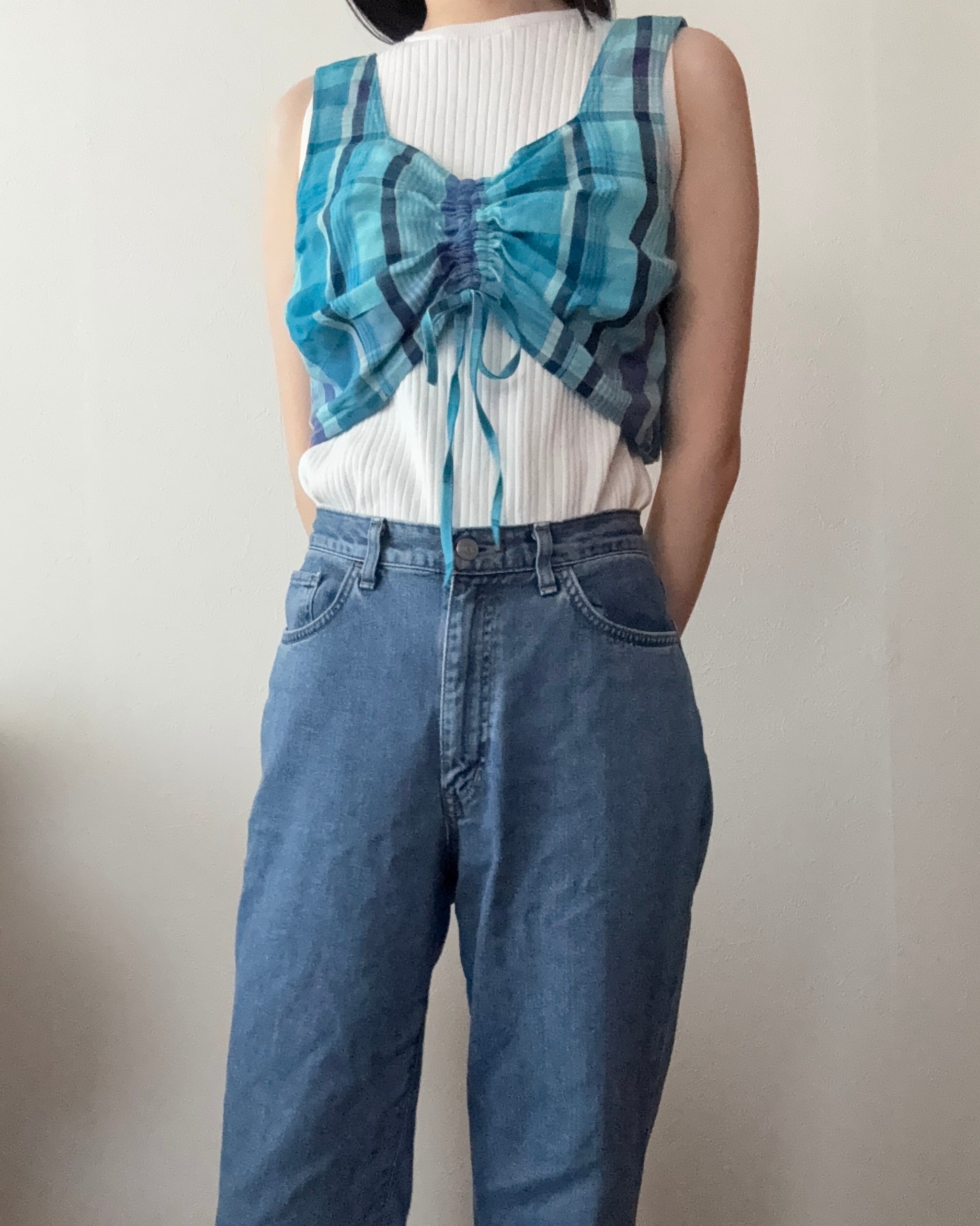 デニムパンツをリメイクした個性的なナップサック。 色の違うデニムを使った蝶モチーフが特徴で、目を引くデザインです。 外ポケットは2つに区切られており、小物の整理がしやすく便利です。マジックテープを付けているので安心。 フリルが可愛い雰囲気なので、紐をスポーティにしてバランスをとりました! 裏地の赤白ギンガムチェックにもキュン。 ▼平置き 縦約43 横約37 ▼外ポケット 縦約16 横約18 が2つ