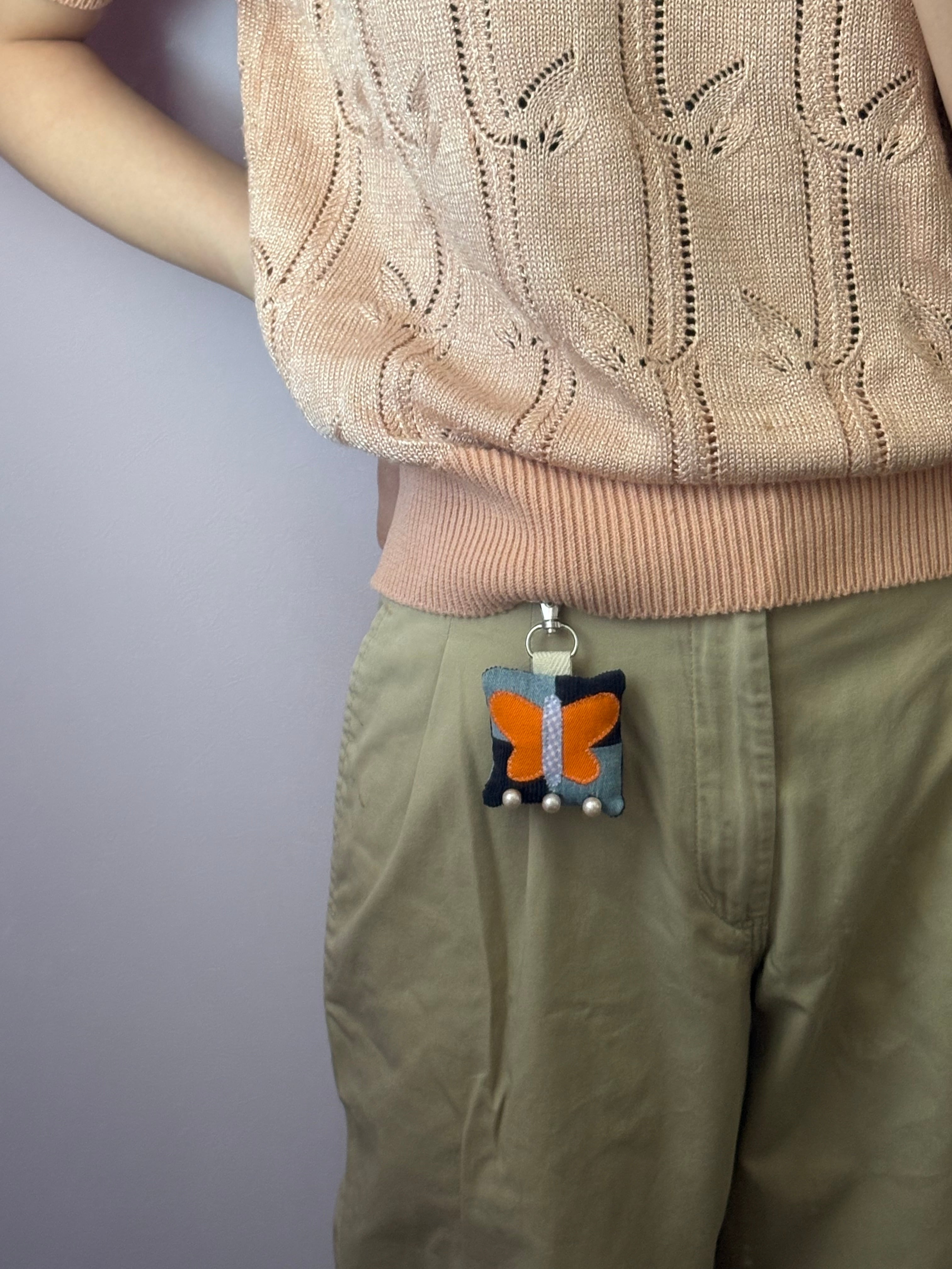 古着のデニムシャツをリメイクしたキーホルダーです! デニムと襟のコーデュロイのツートンをバックに 蝶モチーフを縫い付けました。 下にはビーズを縫い付けています。 バッグにつけたり、アクセサリー感覚でベルトループにつけたり… その日の気分で、お好きな面が見えるように付けていただけたらと思います。 ▼平置きサイズ (金具含む)縦約10 横約6 (金具.タブ含まず)縦約6 横約6
