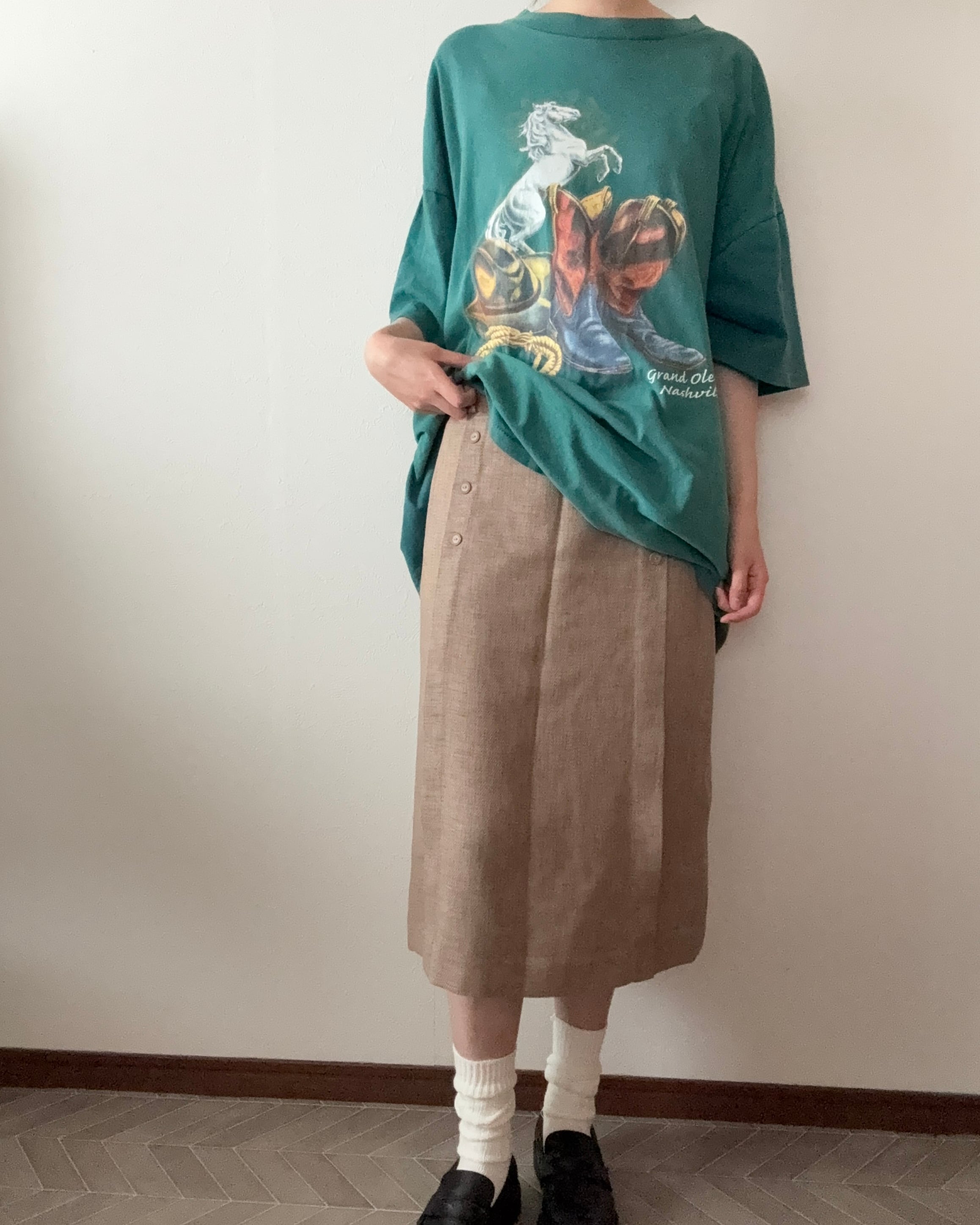 裏地もあるのでスカートだけで履くこともできますが、パンツに重ねて履いても可愛いです。