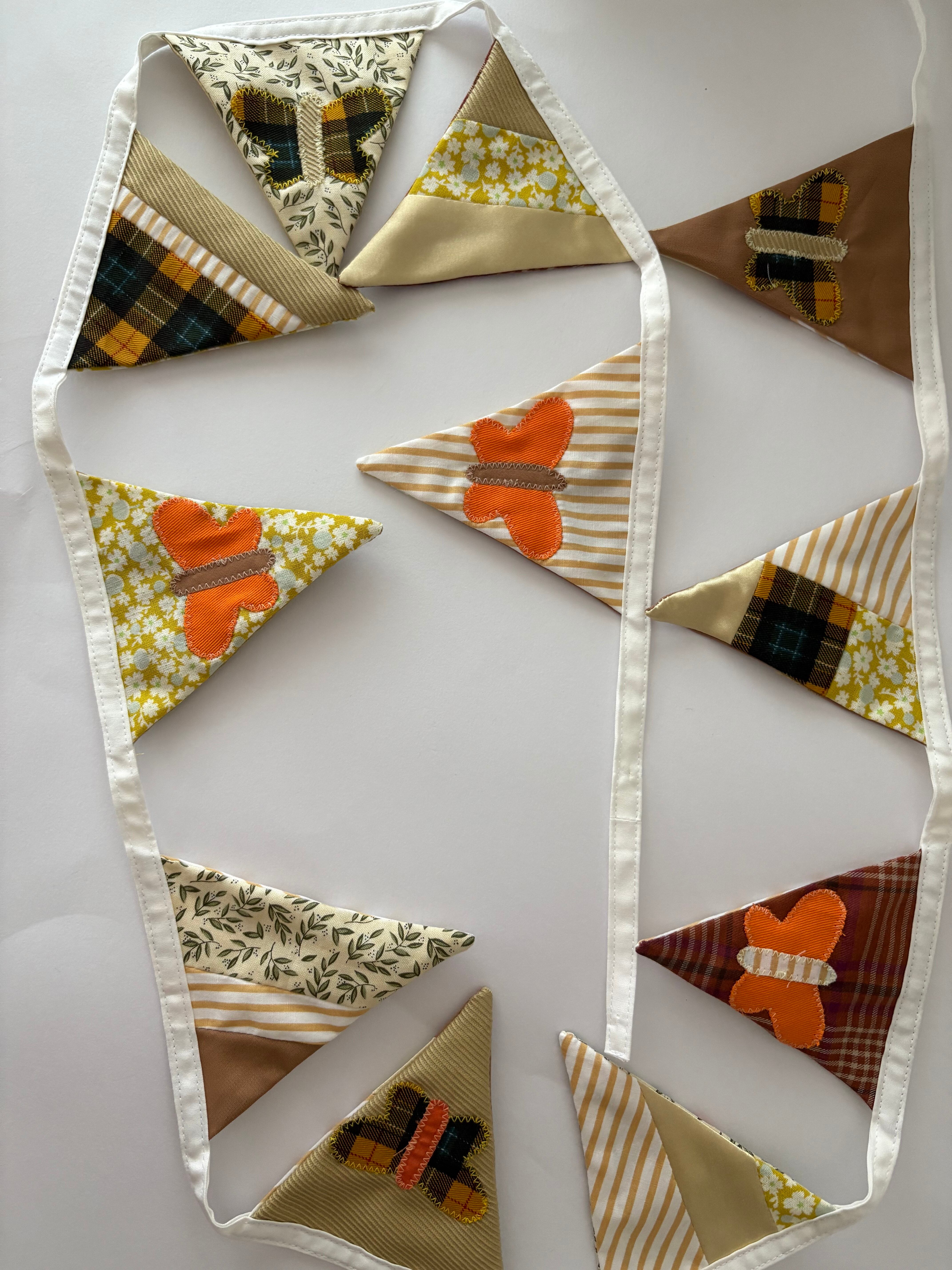 細かい生地の切り替えが施されたフラッグガーランド。片面に蝶、もう片面にはお花のデザインが楽しめる、贅沢なアイテム。