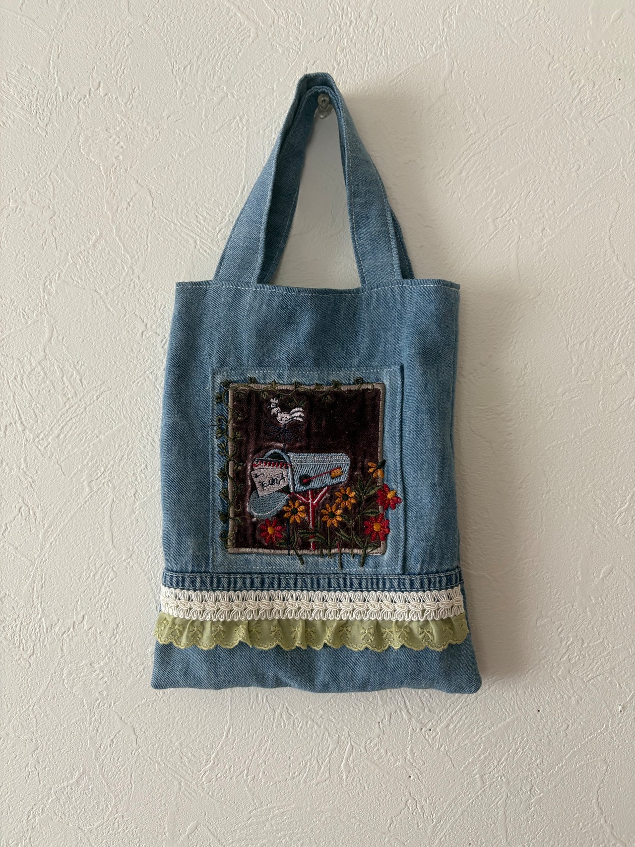 古着のデニムシャツをリメイクしたハンドバッグ。
