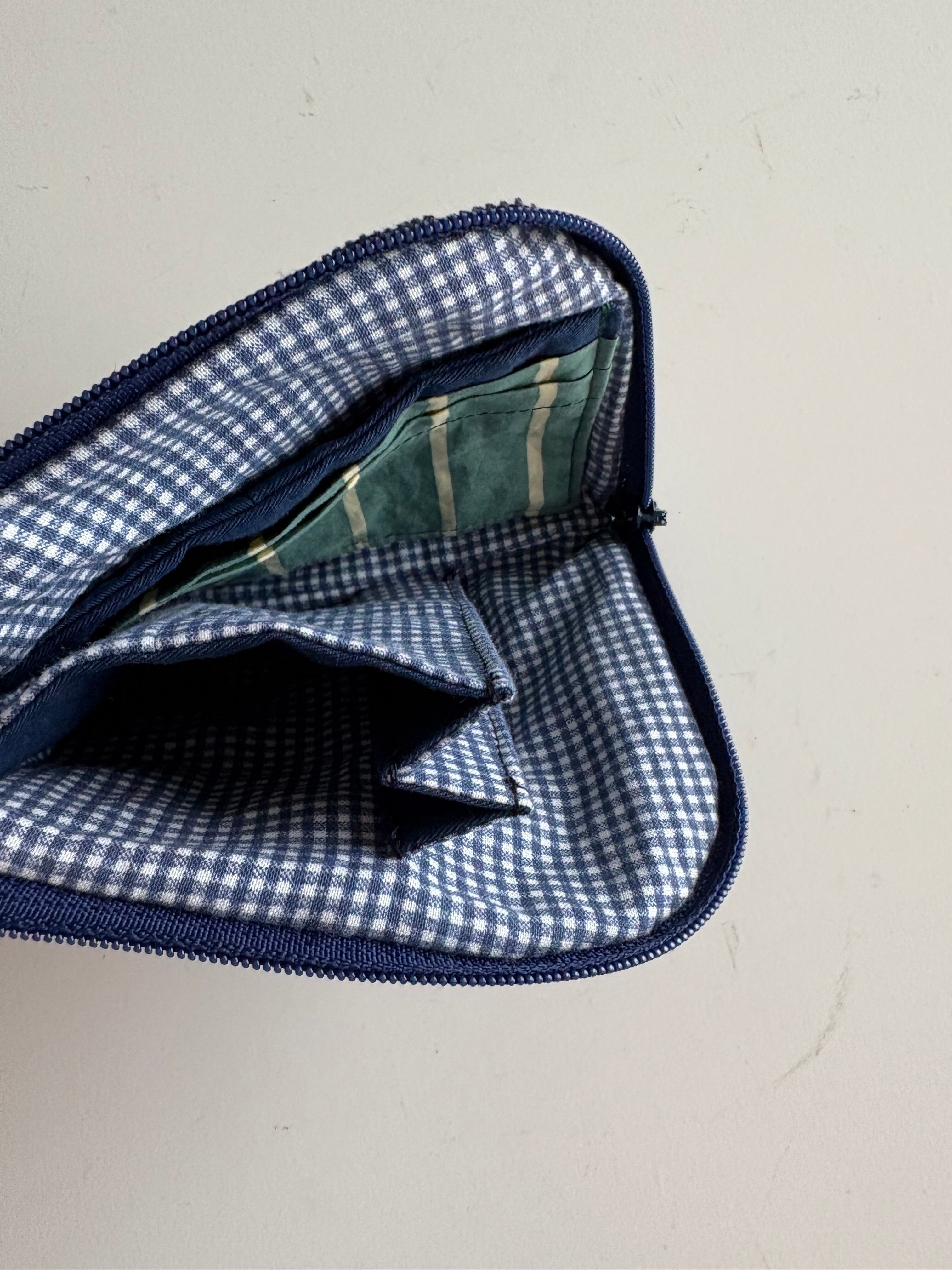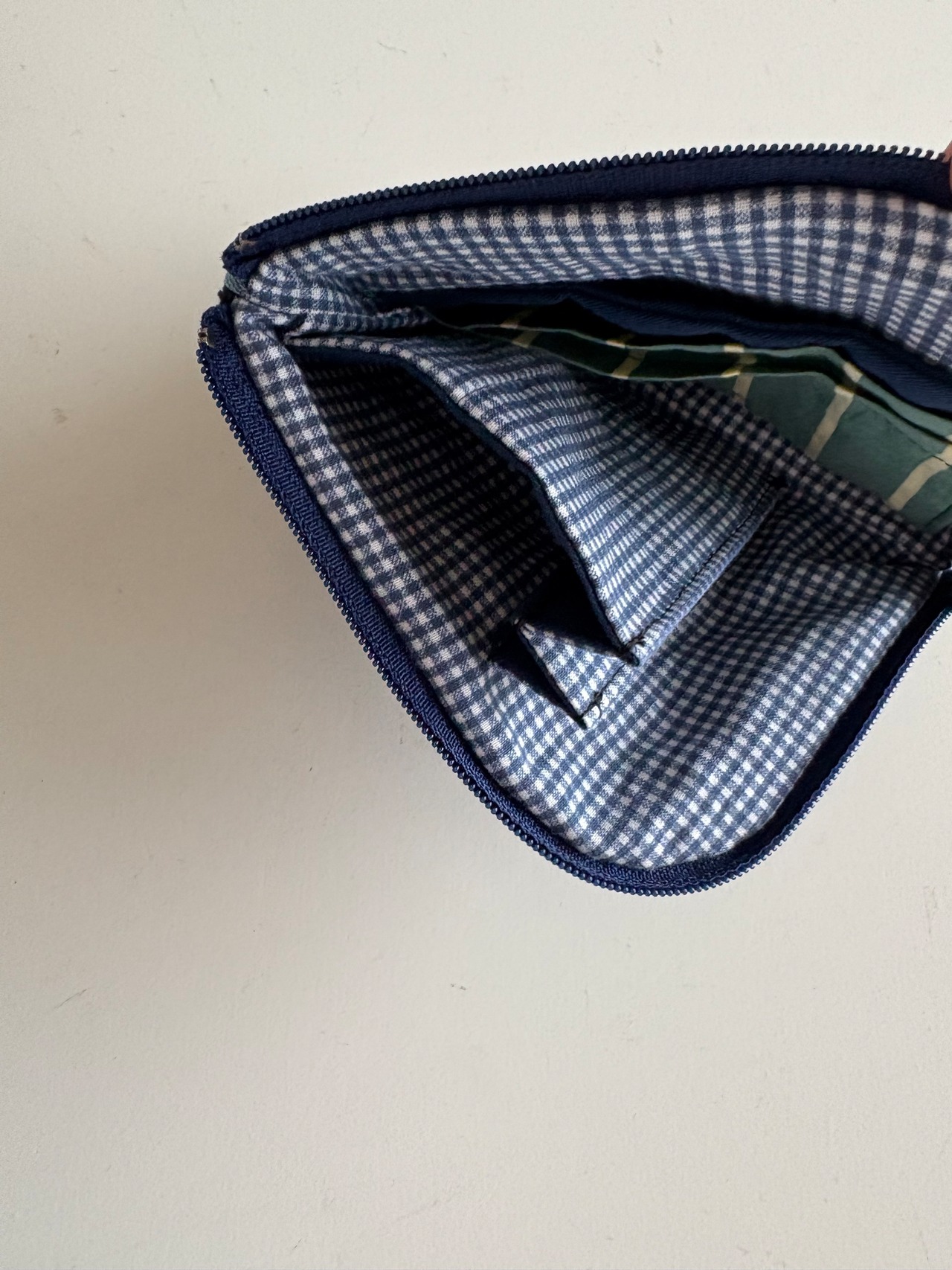 内側はネイビーの細かいギンガムチェックをメインに、デニムに合う雰囲気を意識しました。