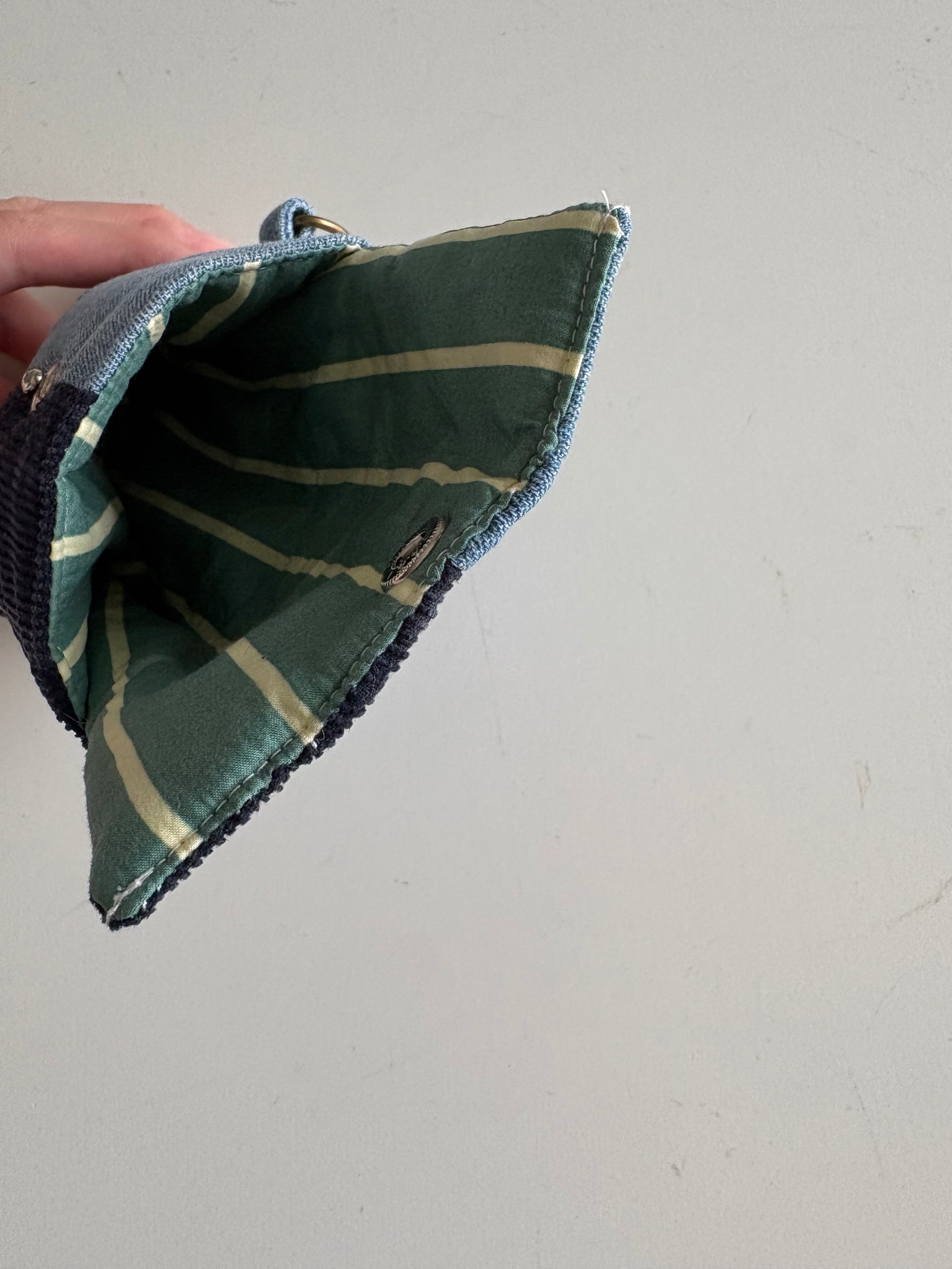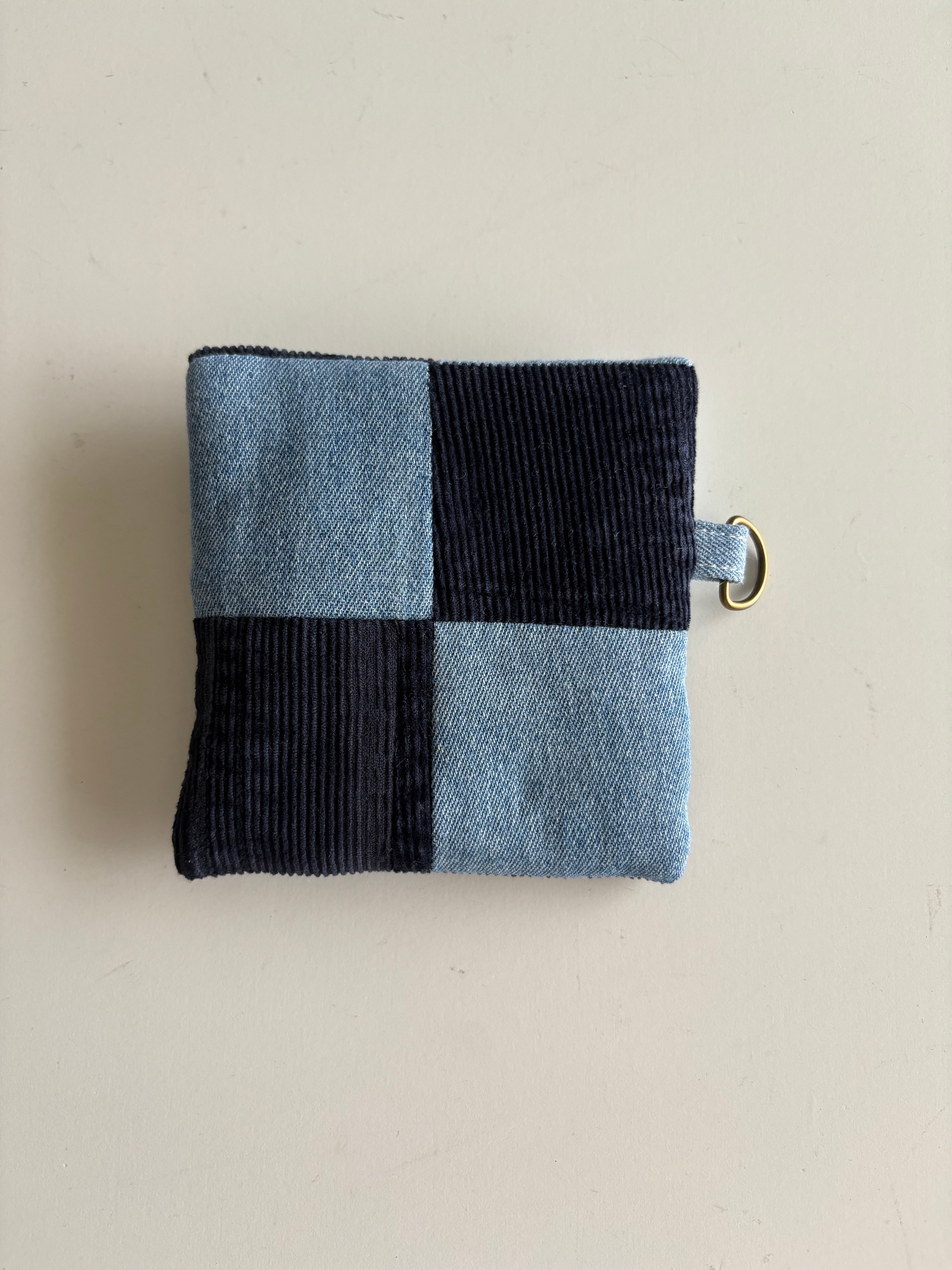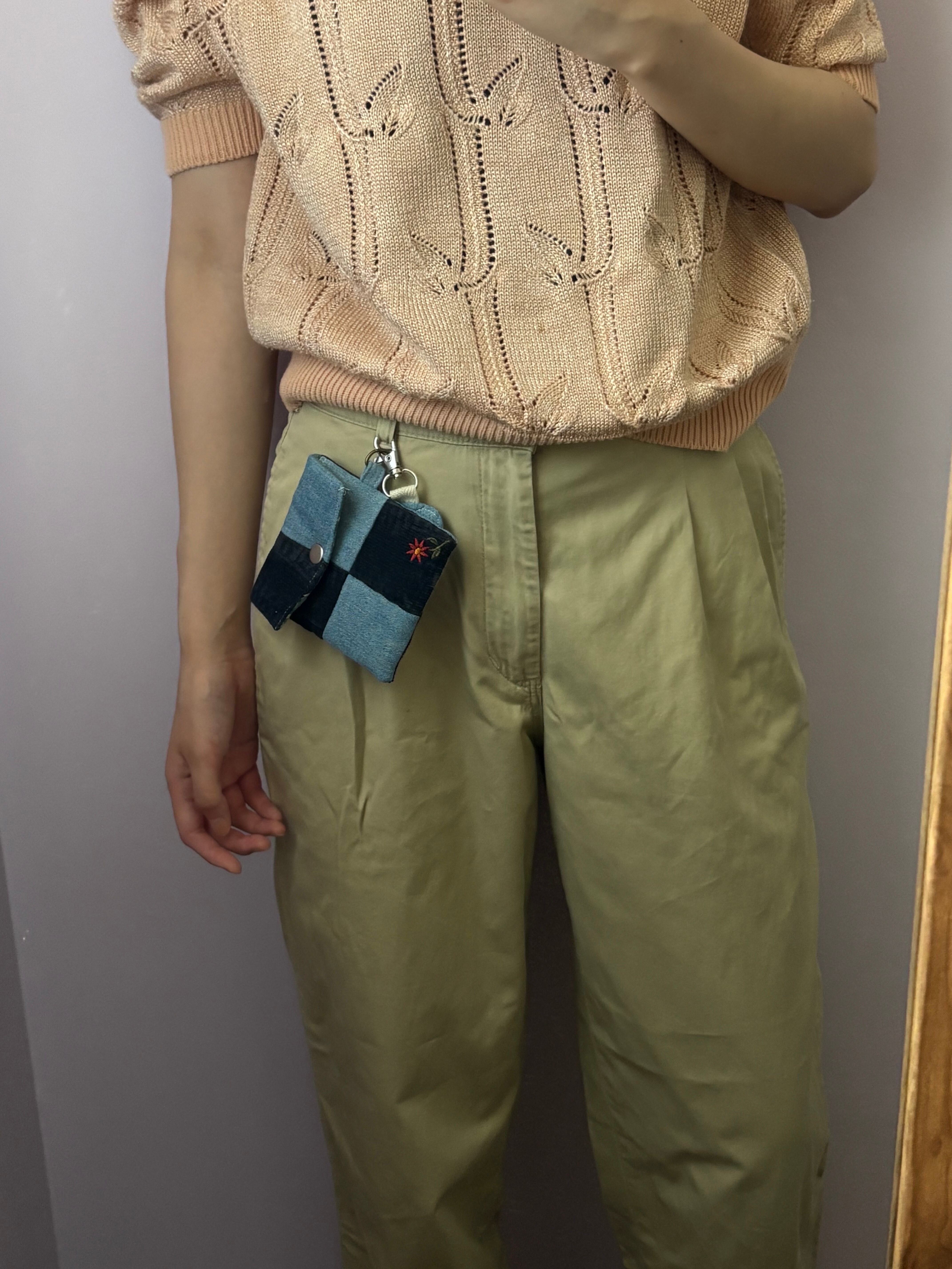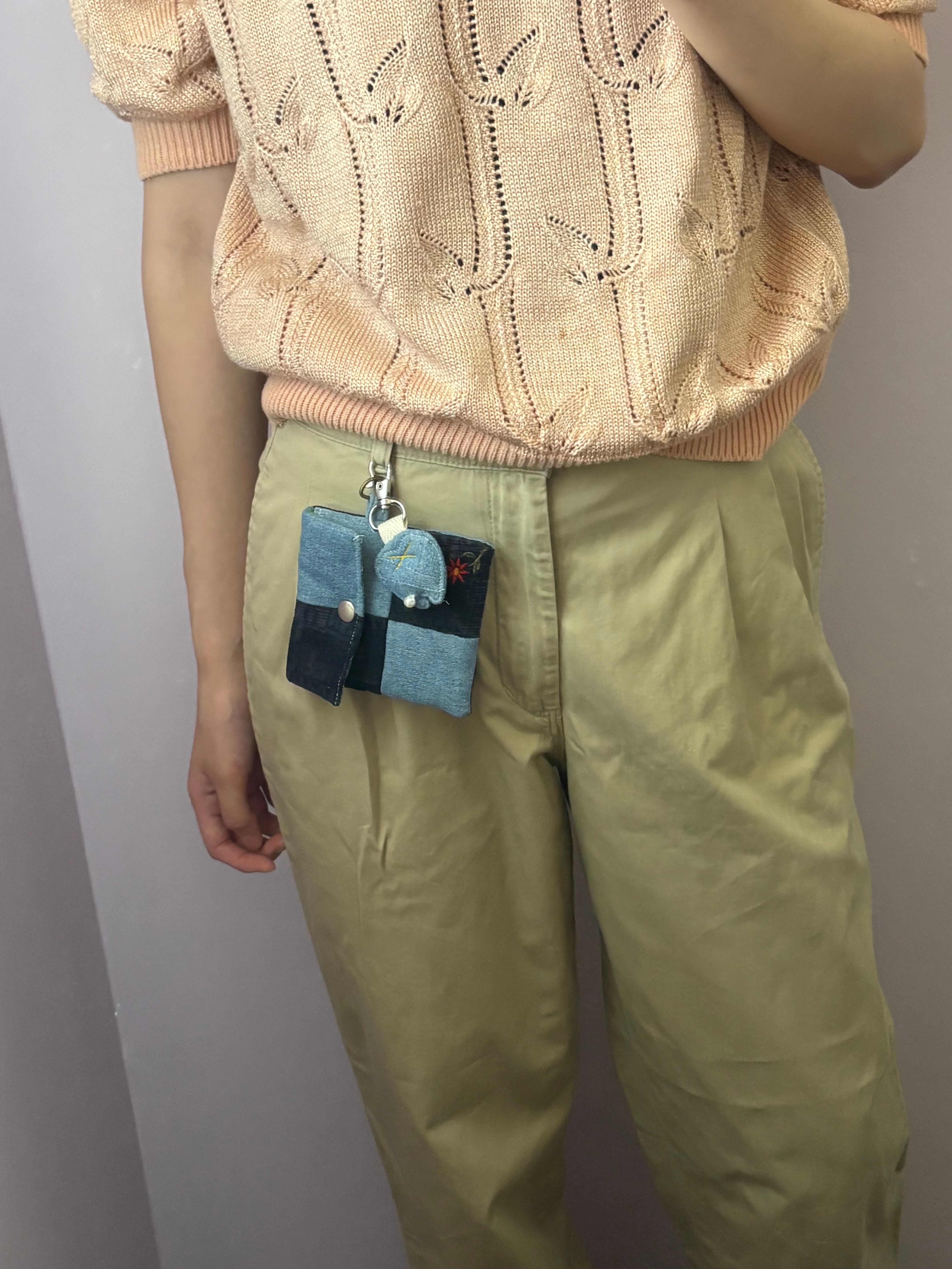 古着のデニムシャツをリメイクしたボタンポーチ。