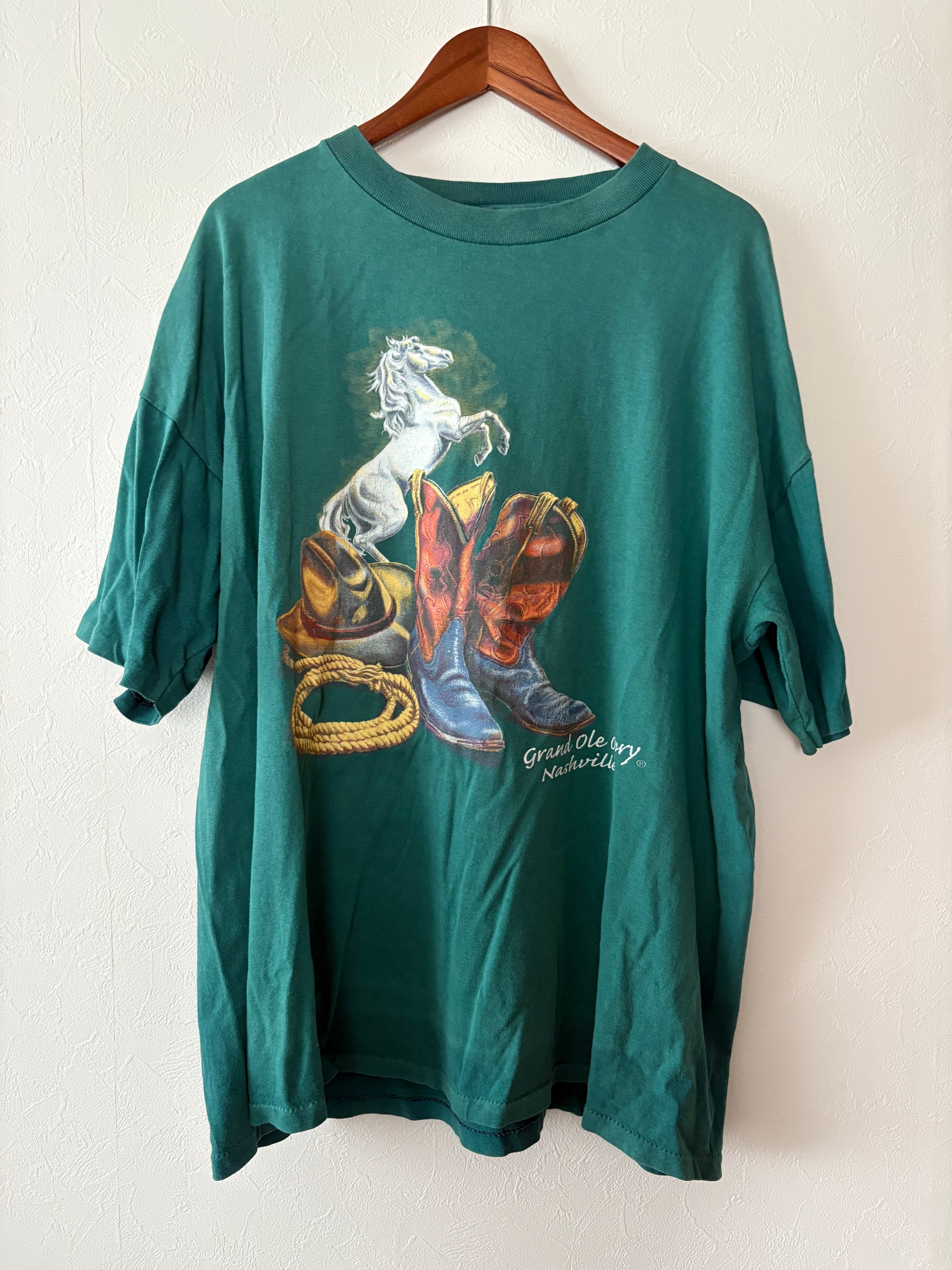 グリーンのボディにカウボーイを思い出させるデザインがプリントされたTシャツ。
