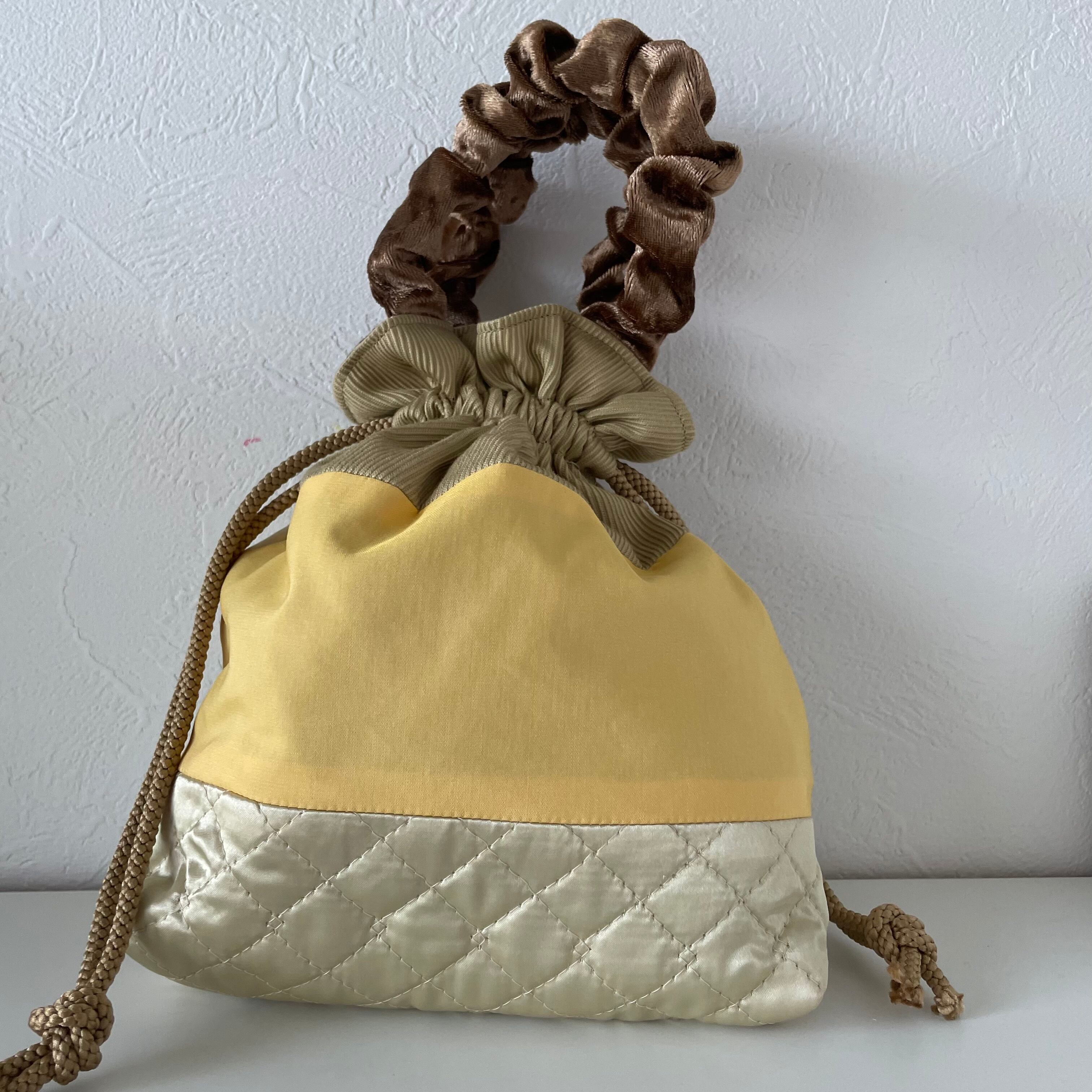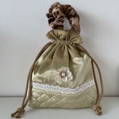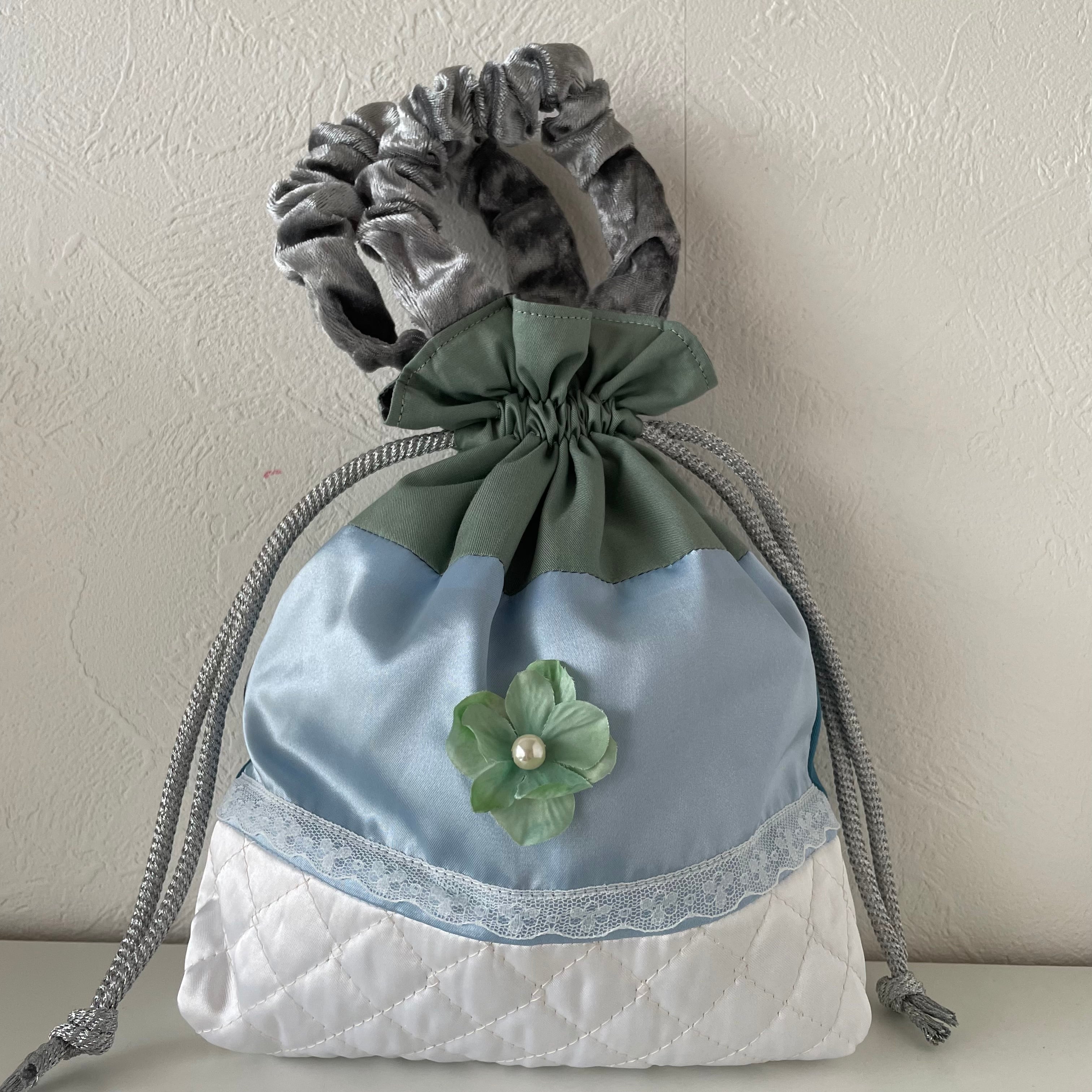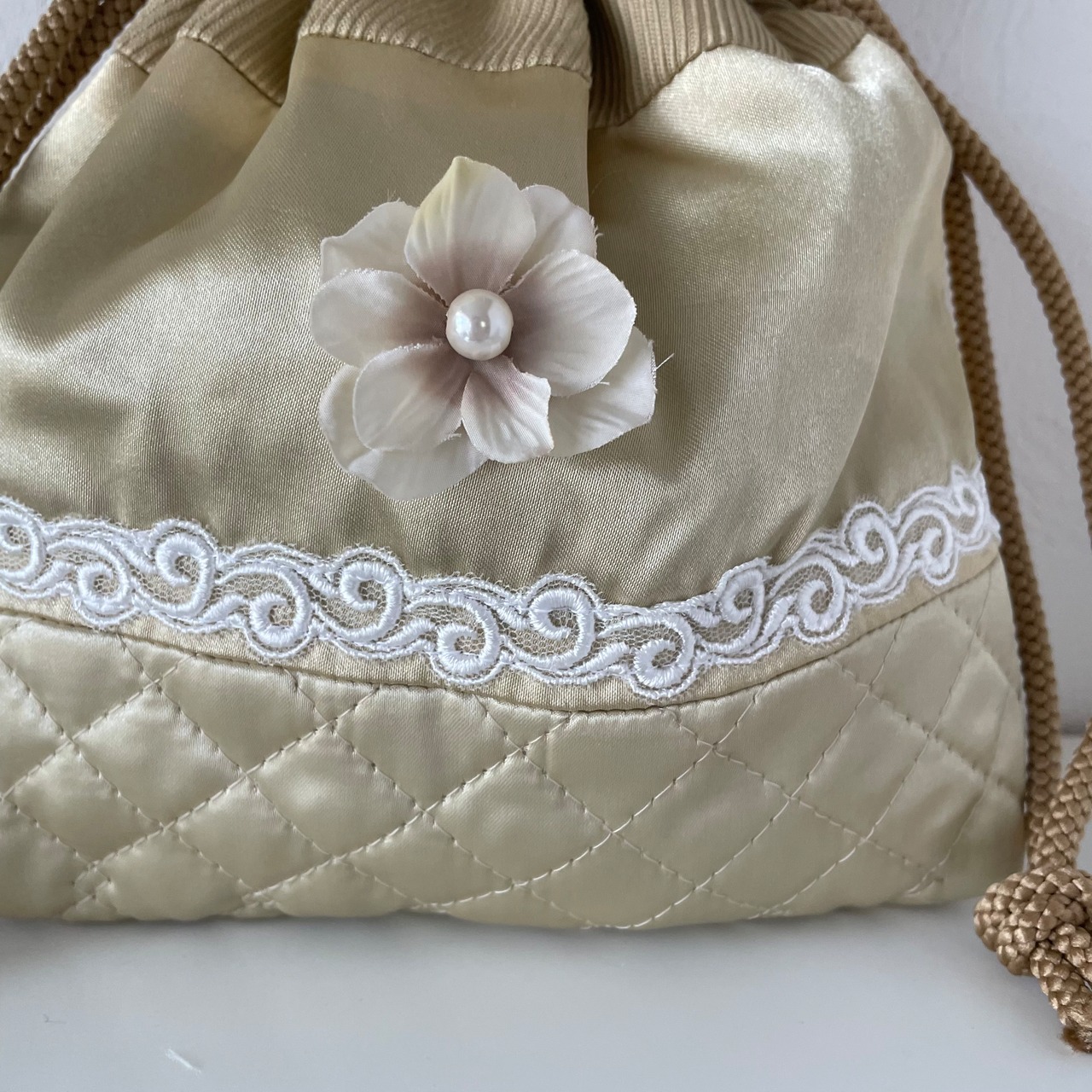 お花の装飾がアクセントの持ち手付き巾着バッグ。