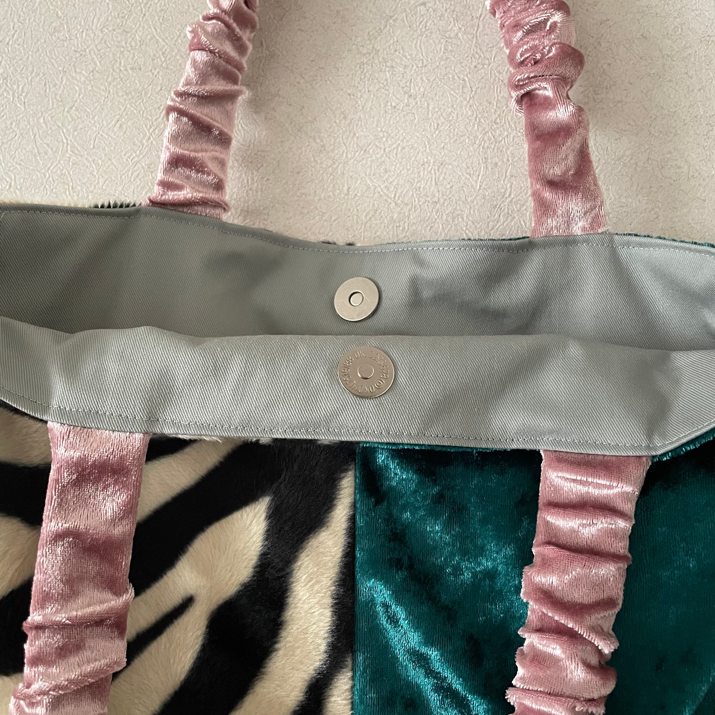 もふもふのゼブラ柄にグリーンのベロア、持ち手をピンクのベロアで作りました。