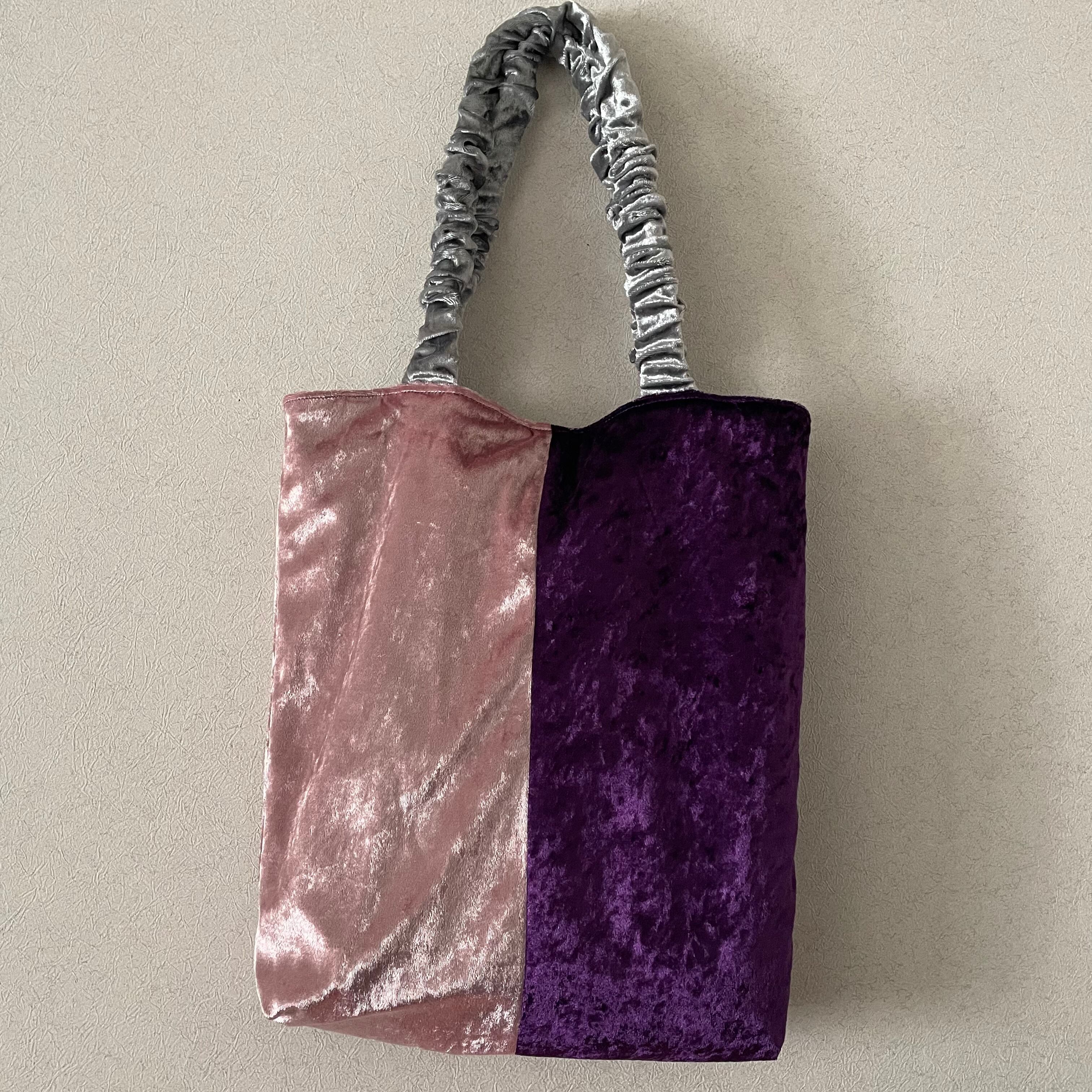 ピンクのベロアに深いパープルのベロア、持ち手をシルバーのベロアで作りました。
