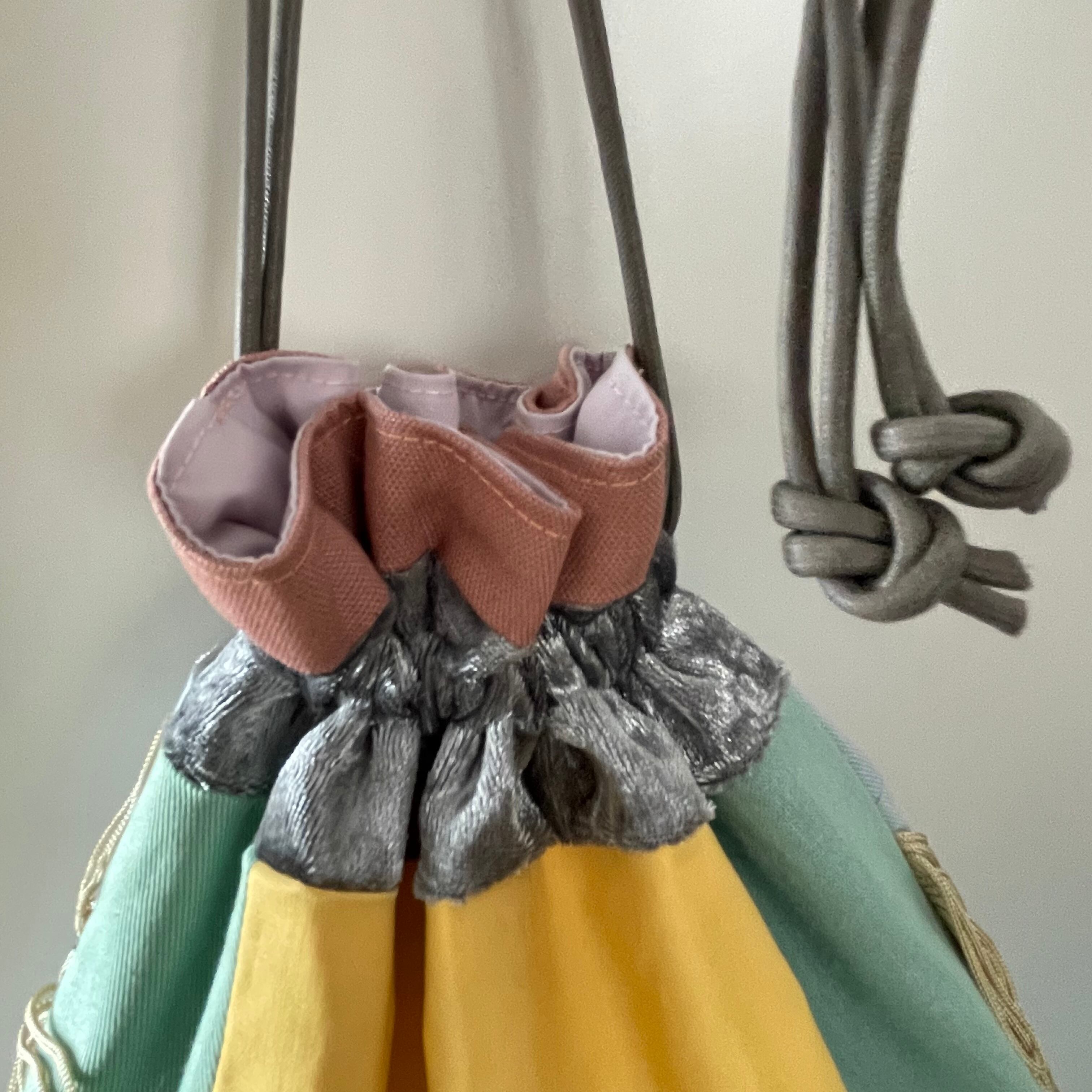 持ち手の紐が長く肩がけできるミニ巾着バッグ!