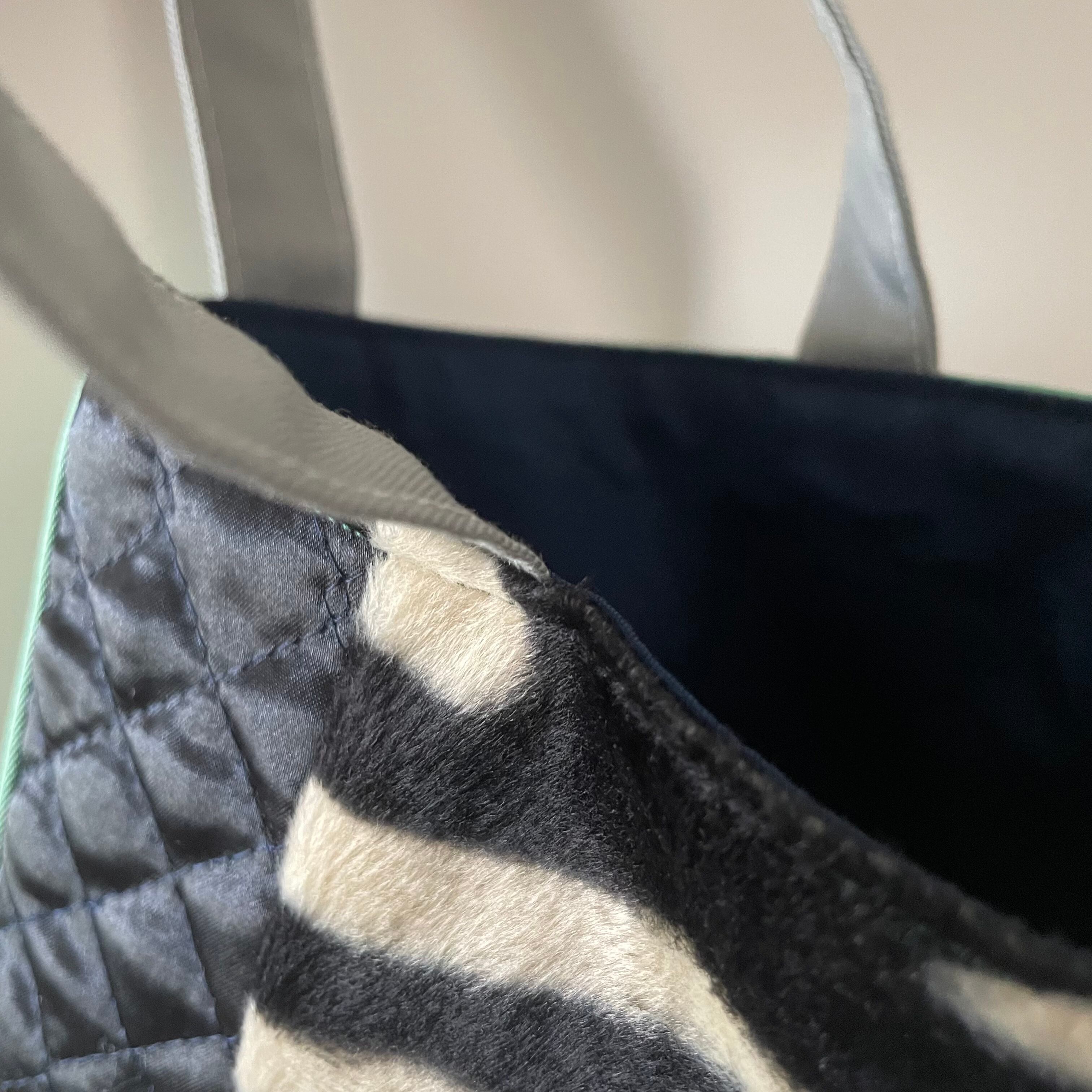 モフモフのゼブラとキルティングに、フリルやグリーンの生地を組み合わせ、シンプルながらも個性的なデザインが特徴です。