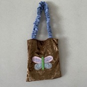 ゴールド系のベロアをメインに使ったのですが、暗い印象にならないように、持ち手と蝶を明るいデザインにしました♡