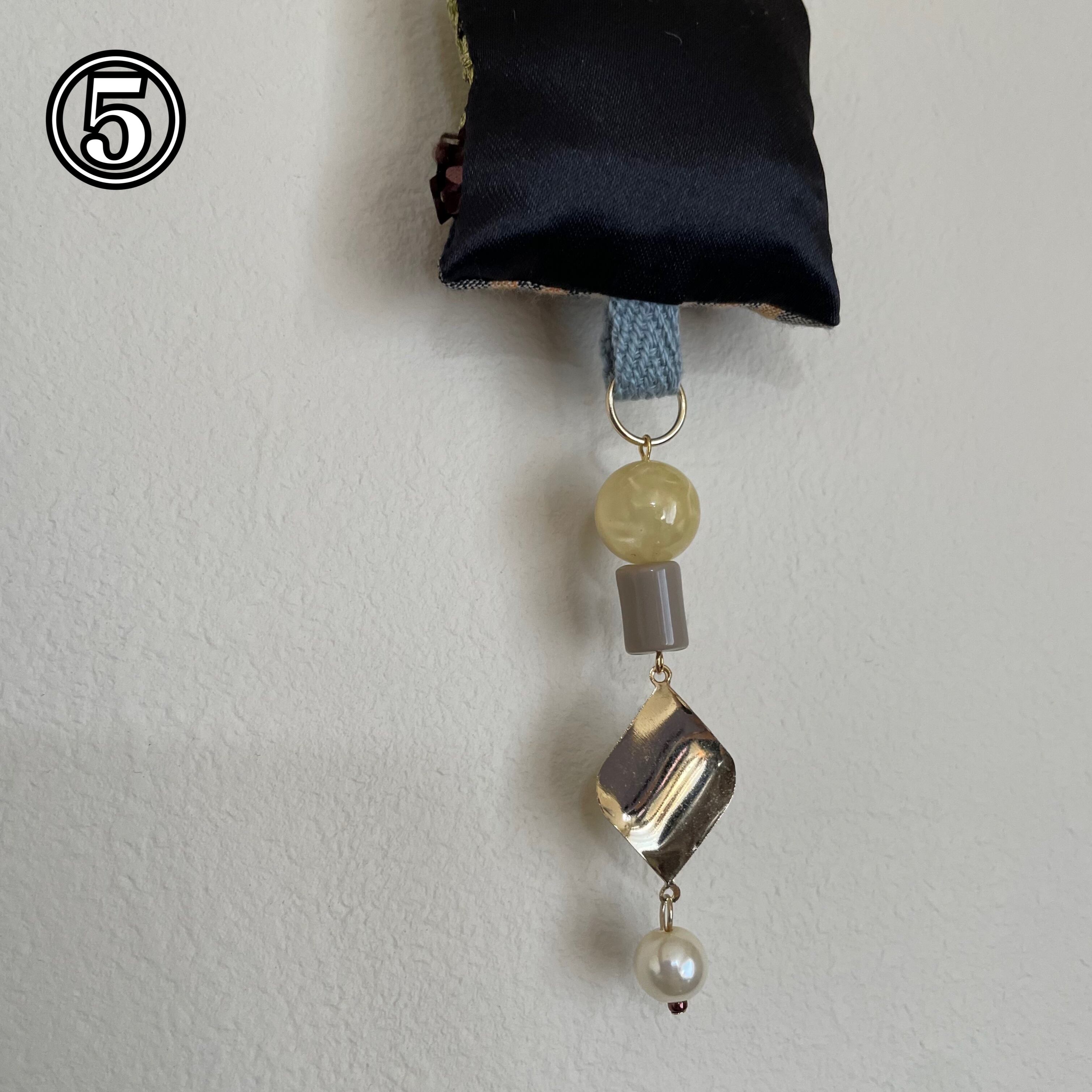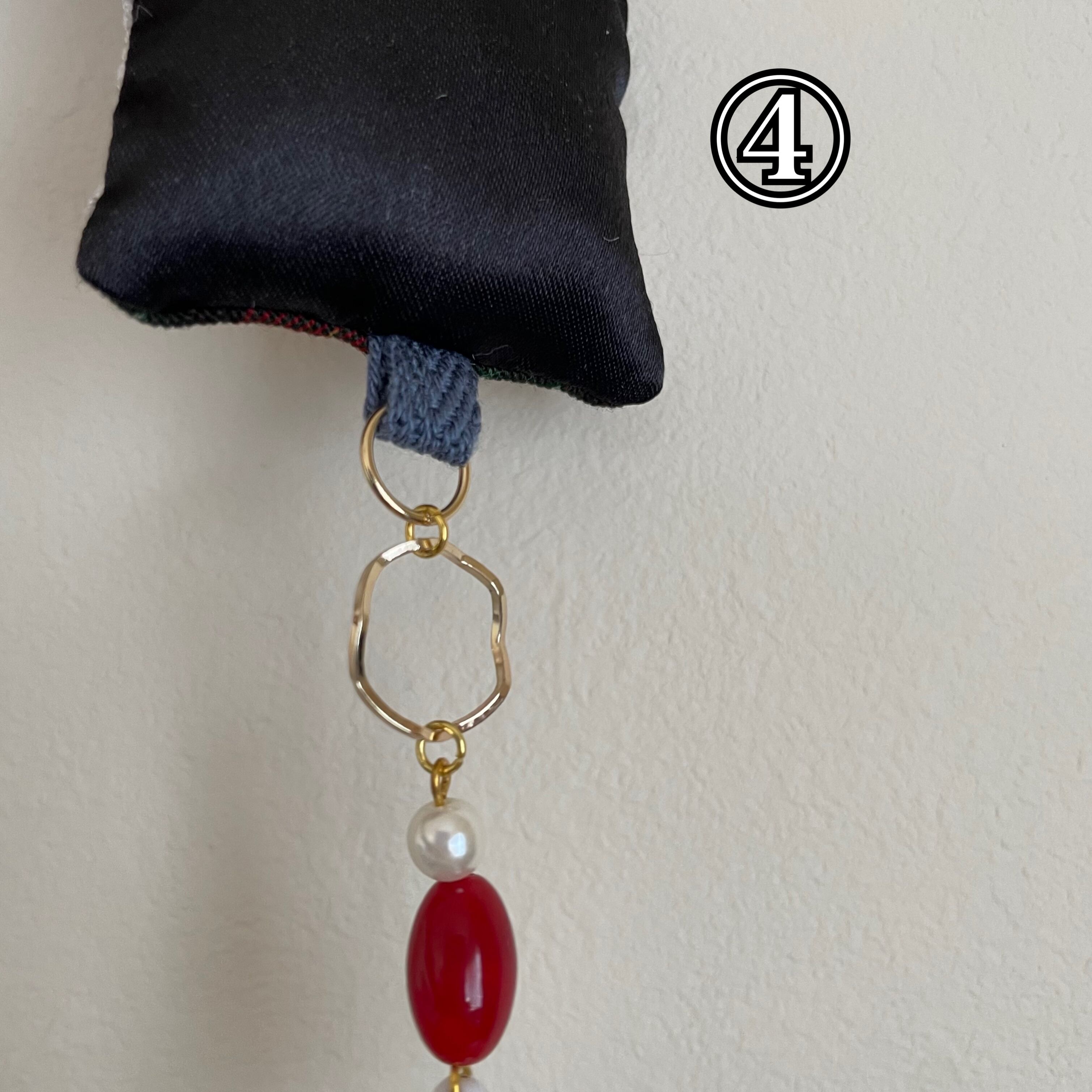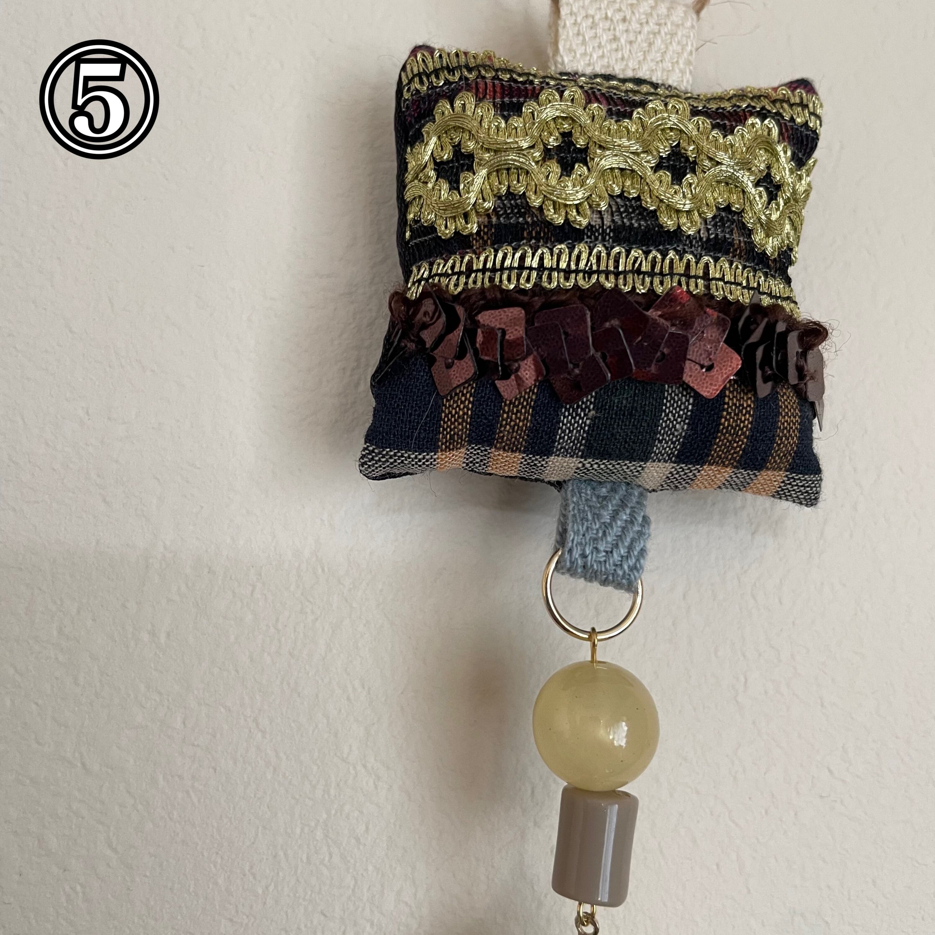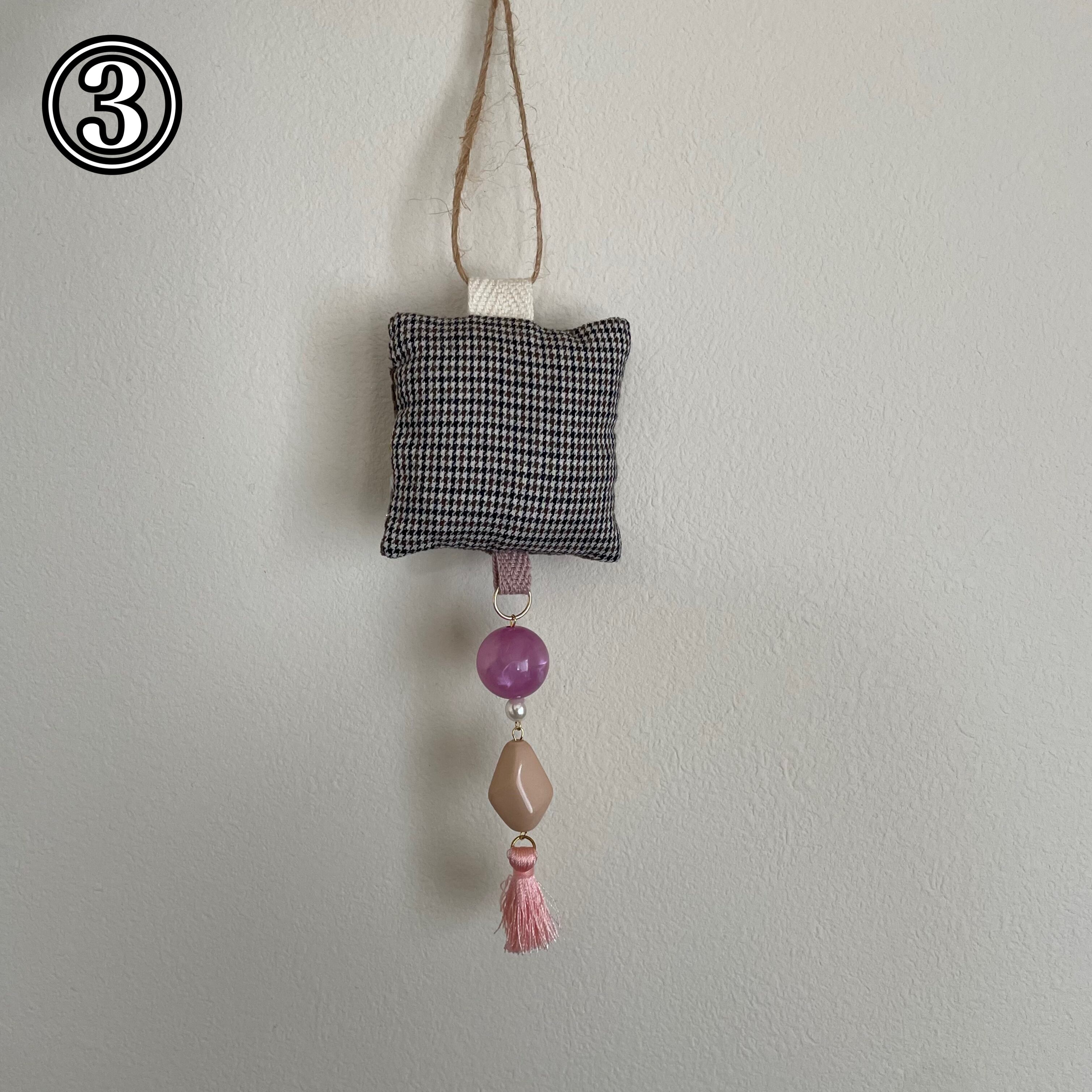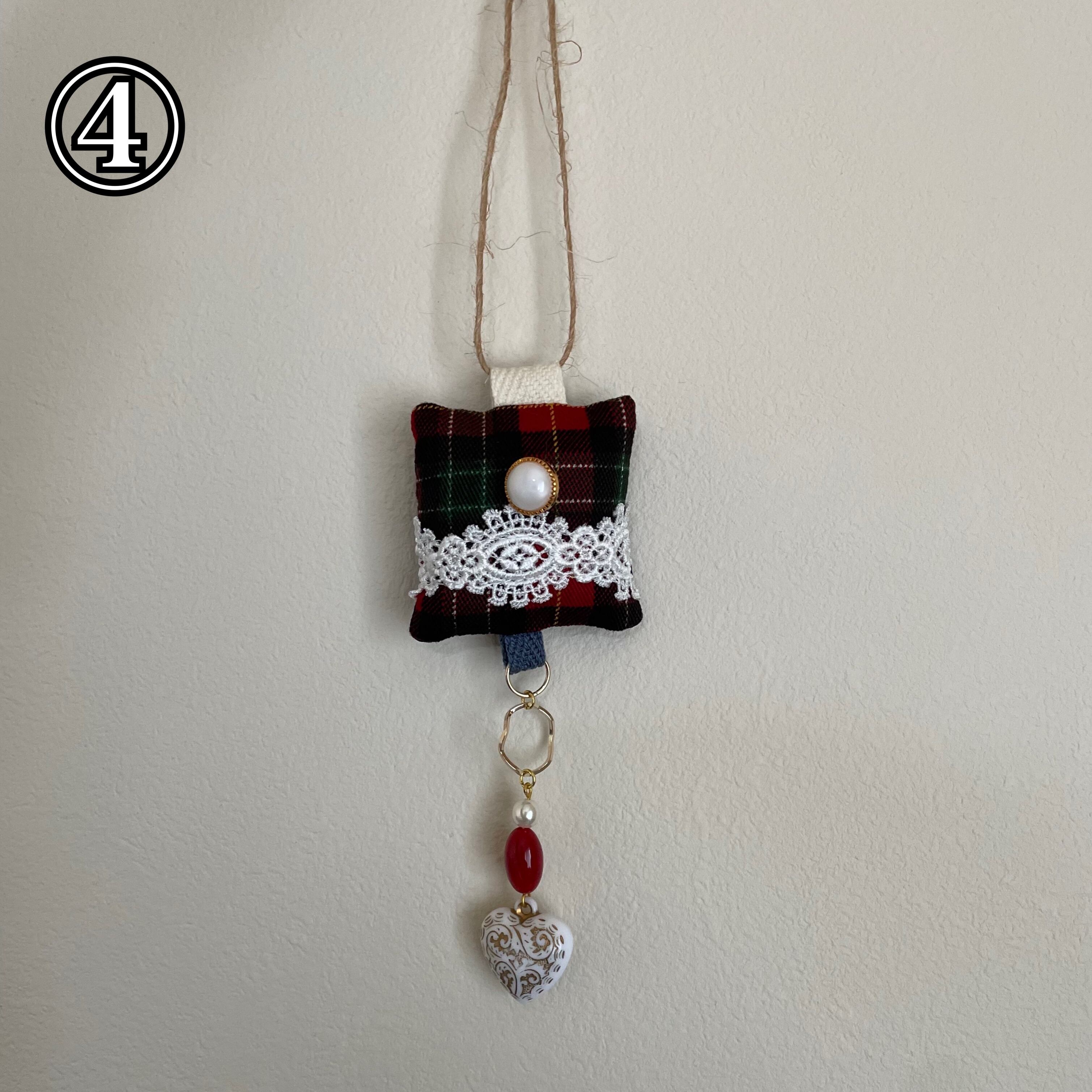 飾りを縫い付けた生地とビーズなどを組み合わせたオーナメントです!生地の部分はクッションのようになっています。