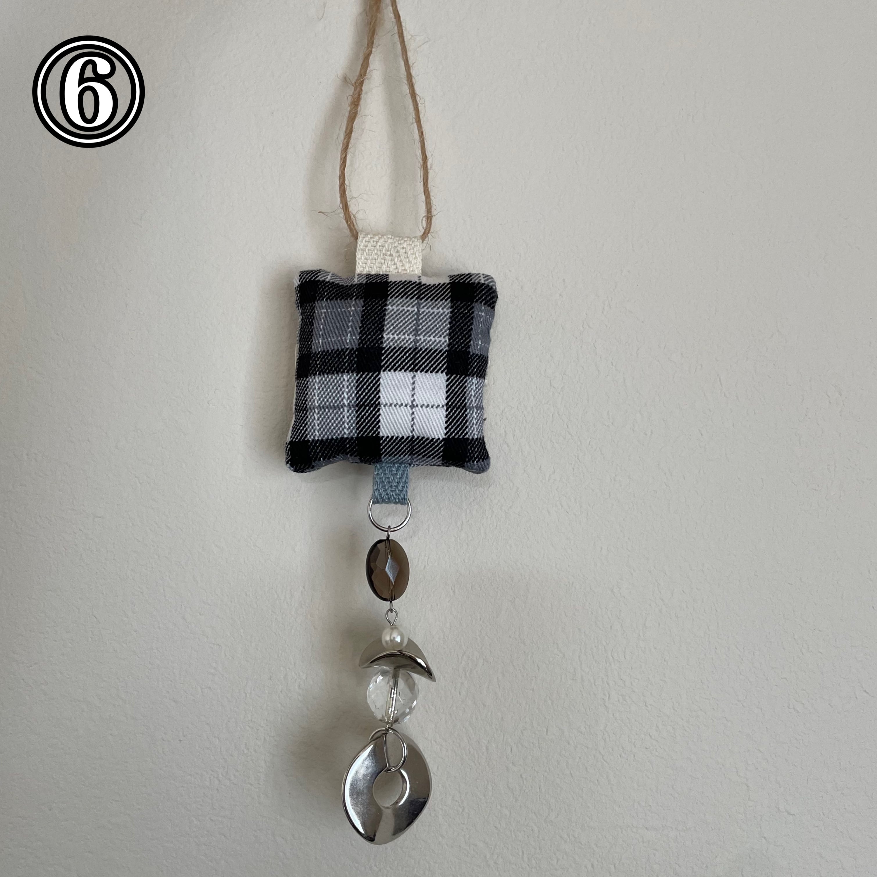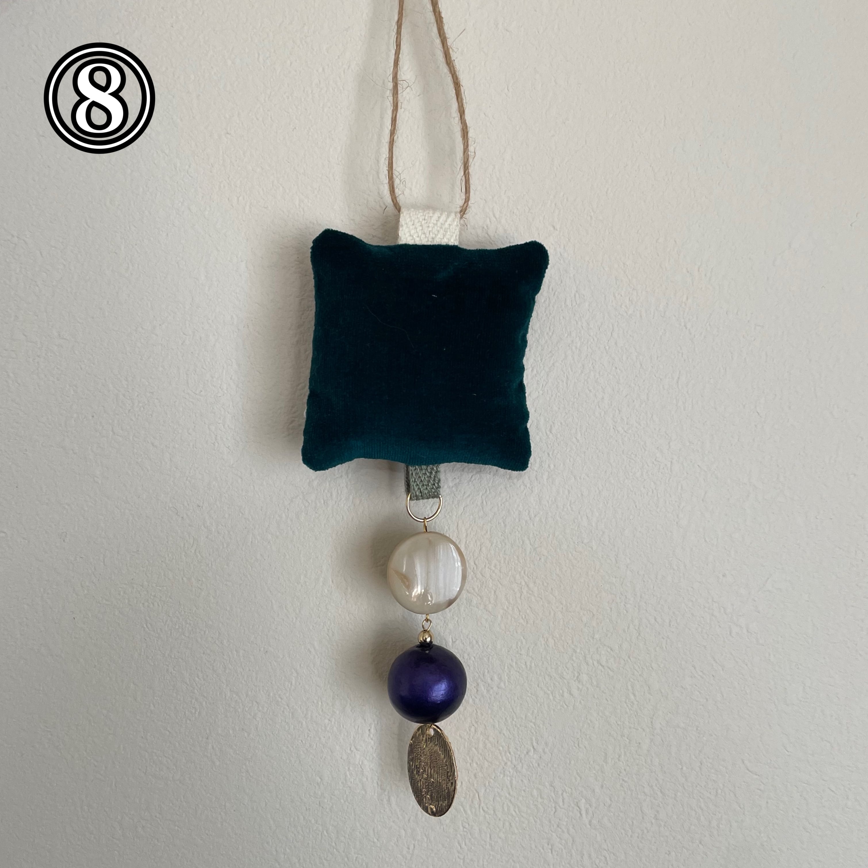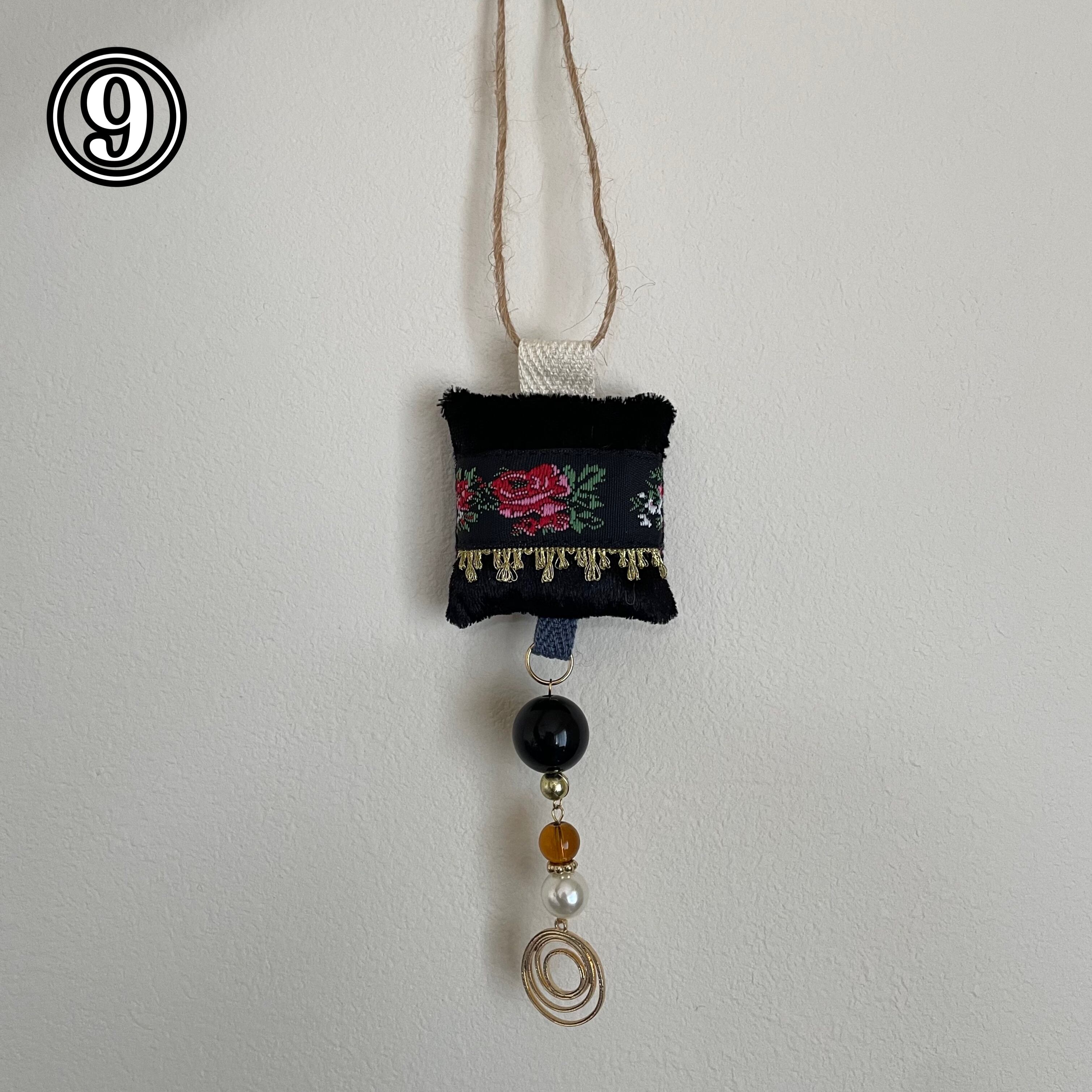 飾りを縫い付けた生地とビーズなどを組み合わせたオーナメントです!生地の部分はクッションのようになっています。